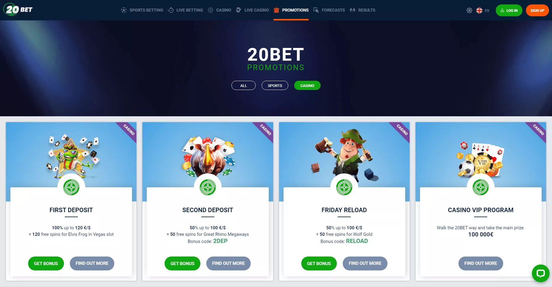Śmiało można powiedzieć, że na pierwszy rzut oka ich oferta jest z półki tych lepszych. Tutaj warto też zaznaczyć, że 20Bet to nie tylko onlinekasyno, ale i zakłady sportowe, i zakłady bukmacherskie na żywo. Oferują nam następujące bonusy: