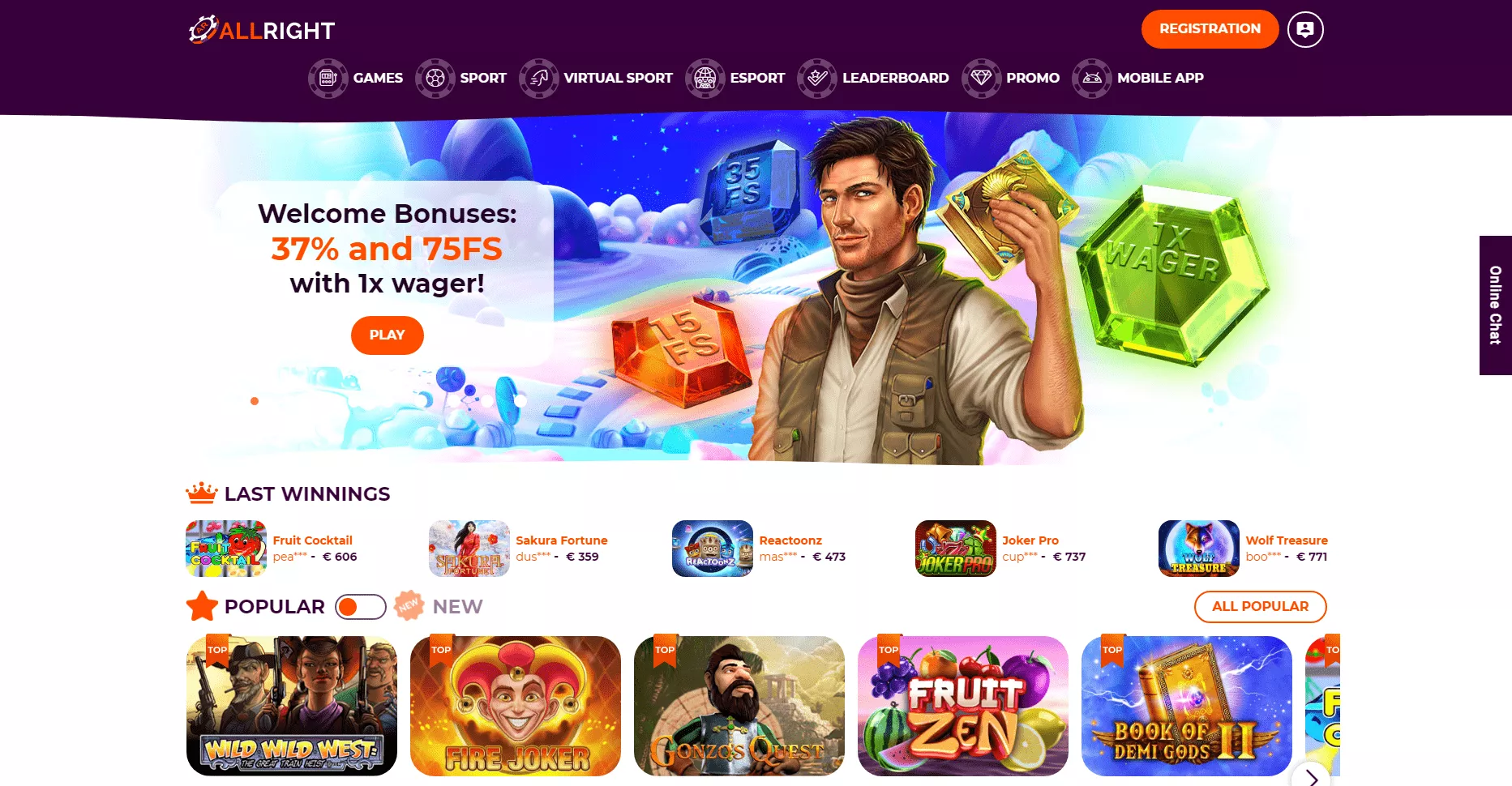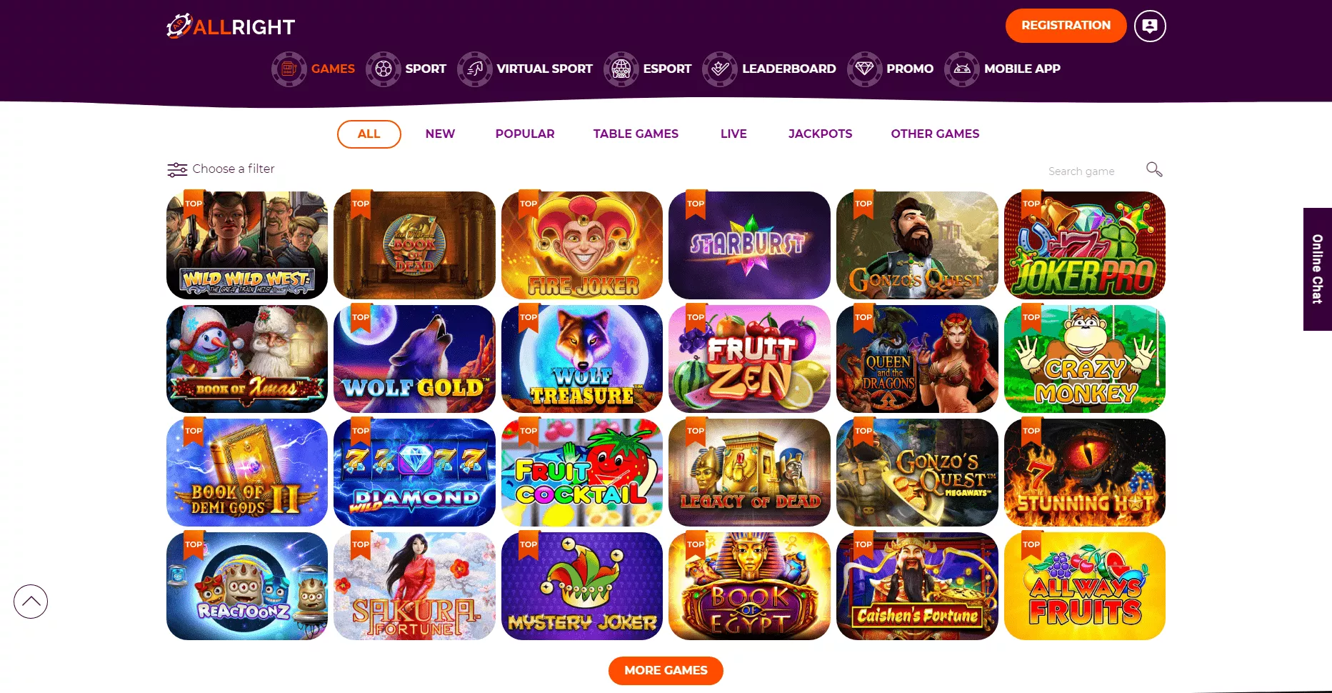 Obecnie oferowana jest przez kasyno AllRight gra online w ponad 4,000 tytuły. Kasyno ma bardzo duży asortyment gier, dlatego polscy gracze mają tu do dyspozycji praktycznie wszystkie istniejące rodzaje rozrywek hazardowych. Gry podzielone są na kategorie takie jak nowe, popularne, stołowe, na żywo i jackpoty.