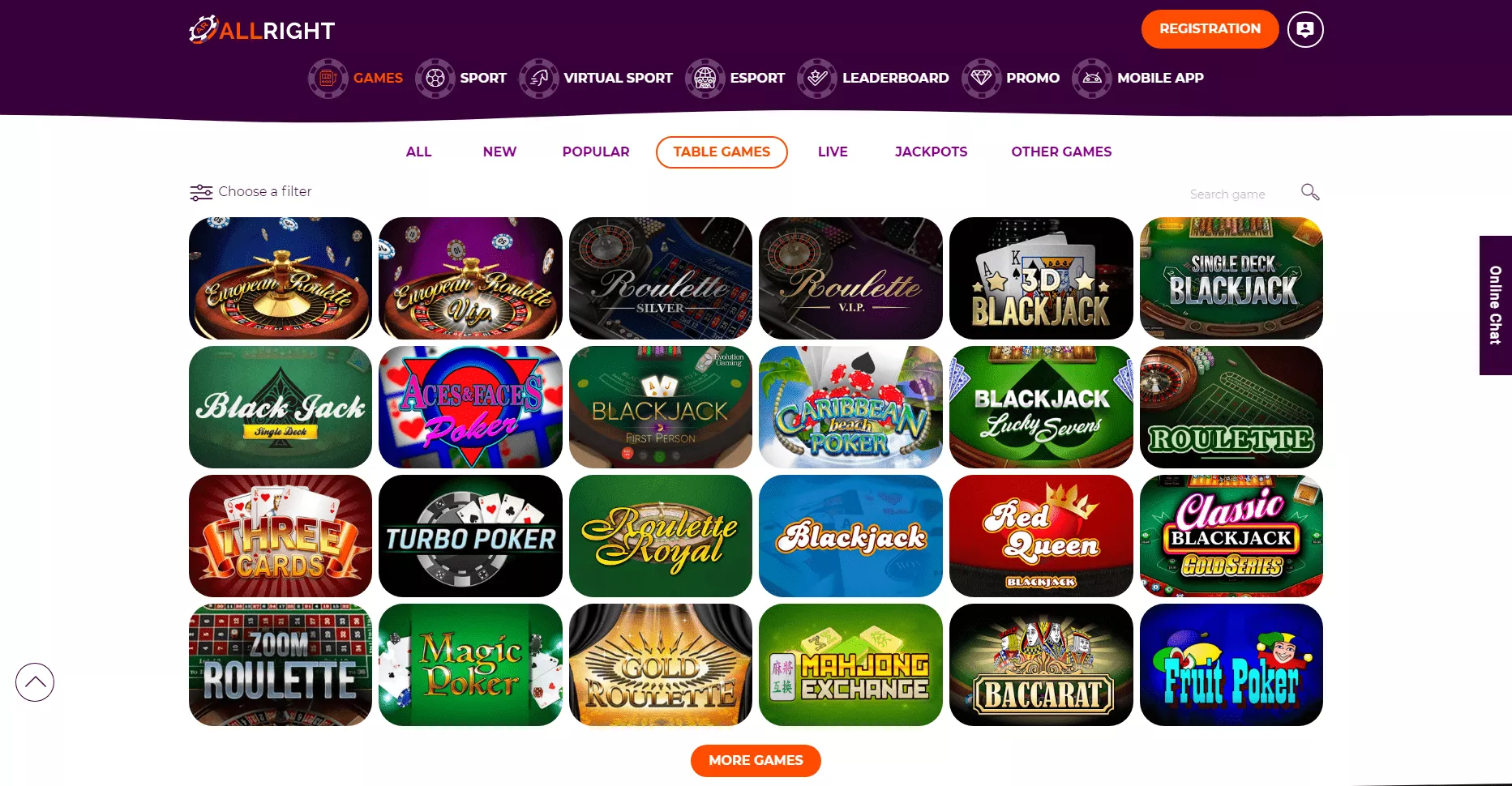 W AllRight automaty do gier na pieniądze stanowią większość oferty, ale warto też wypróbować gry z innych gatunków. Po odwiedzeniu odpowiedniej zakładki wyraźnie widać, że skupiono się na klasykach. Najwięcej jest tu wariantów ruletki i blackjacka, choć można też znaleźć kości, baccarata. Z pewnością znajdziesz tu wiele ciekawych odmian swojej ulubionej gry. Poniżej kilka przykładowych: