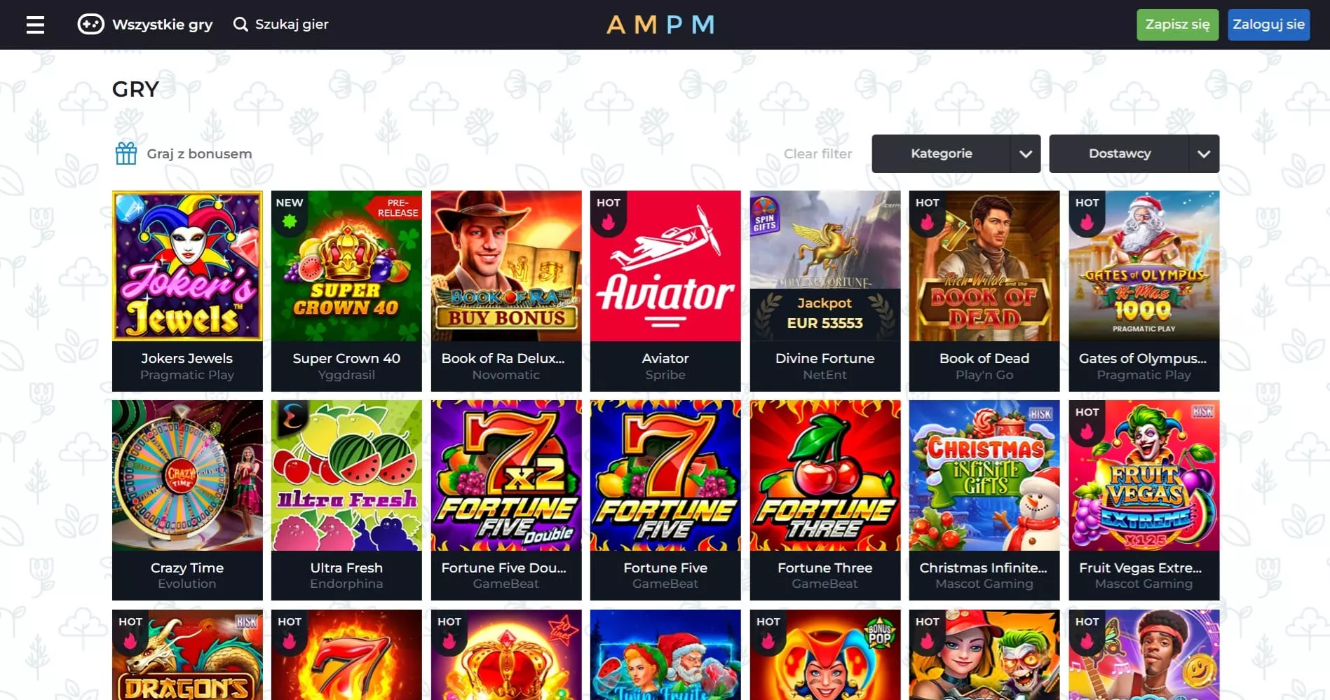 Platforma posiada ponad 5000 gier i współpracę z 70 dostawcami oprogramowania. Średnie stawki RTP znajdują się na poziomie 96%.Dzięki tak bogatej bibliotece tytułów i różnorodnym kategoriom AMPM Casino przyciąga zarówno początkujących, jak i doświadczonych entuzjastów hazardu.