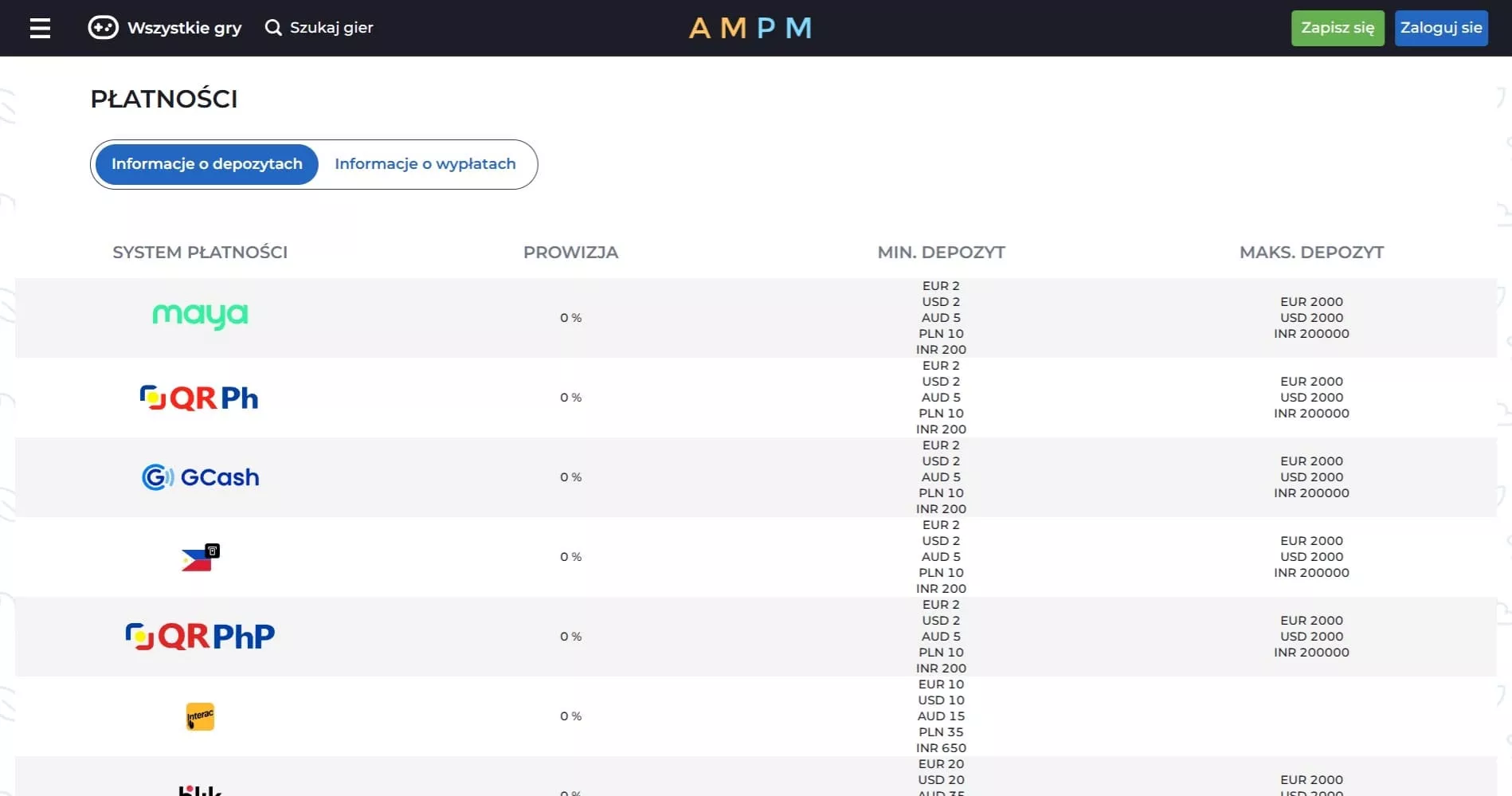 AMPM Casino udostępnia szeroką gamę opcji płatności dostosowanych do potrzeb polskich graczy. Platforma umożliwia dokonanie wpłat za pomocą 26 różnych metod, z których 14 to kryptowaluty. Any sprawdzić opcje wypłaty w AMPM Casino, należy dokonać depozytu na platformie.