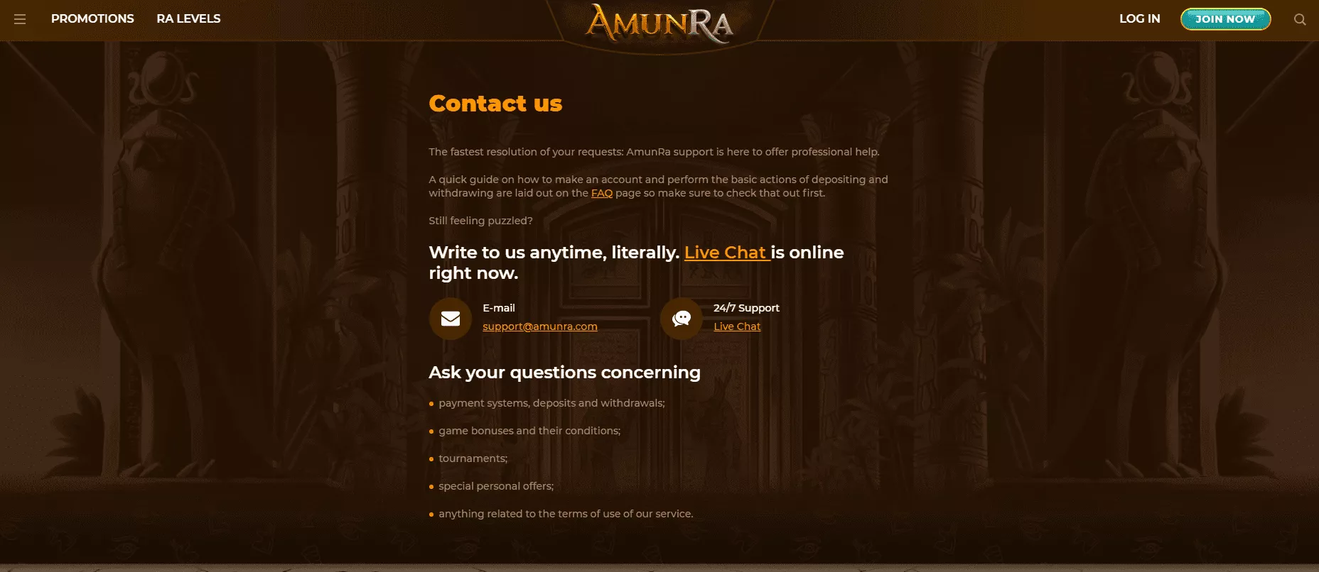 Kasyno AmunRa oferuje wsparcie klienta na najwyższym poziomie. Skontaktować się z nimi możesz 24 godziny na dobę, siedem dni w tygodniu. Oczywiście w języku polskim. Do dyspozycji masz czat online oraz adres mailowy. Obsługa z całych sił będzie starała się pomóc rozwiązać twoje problemy.