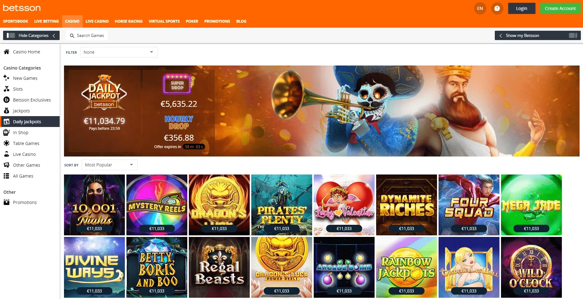 Operator umożliwia graczom dostęp do ponad 1300 tytułów gier od najlepszych deweloperów, stale aktualizując swoją ofertę o nowe tytuły. Cały katalog gier jest łatwy w nawigacji. Użytkownicy mogą wyszukać ulubione gry korzystając z menu i podkategorii takich jak: Wszystkie gry, Nowe gry, Sloty, Jackpoty, Ekskluzywne gry Betssona, Gry stołowe, Kasyno na żywo, Video poker, Codzienne jackpoty oraz Inne Gry. Ponadto wchodząc w każdą z kategorii, można sortować gry alfabetycznie lub od aktualnie najpopularniejszych tytułów.