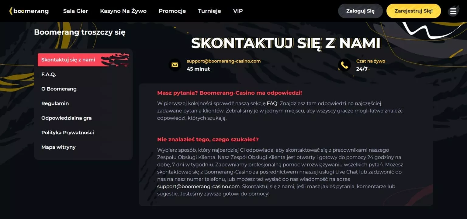 Wysyłając wiadomość e-mail pod adres: support@boomerang-casino.com można oczekiwać odpowiedzi już po 45 minutach.