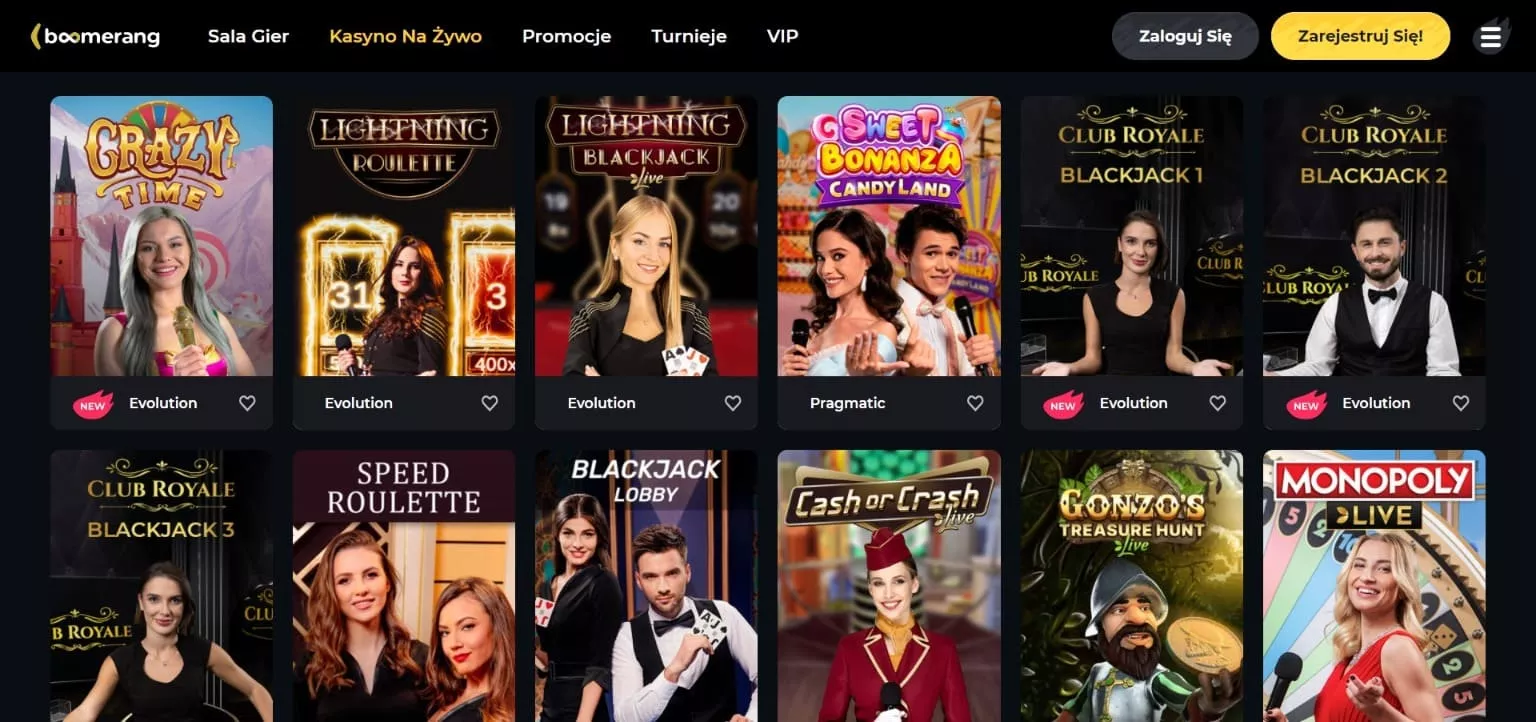 To oczywiście tylko niewielki fragment pełnej oferty kasyna na żywo w kasynie Boomerang. Cała oferta gier z prawdziwym krupierem jest dostępna wyłącznie na prawdziwe pieniądze.