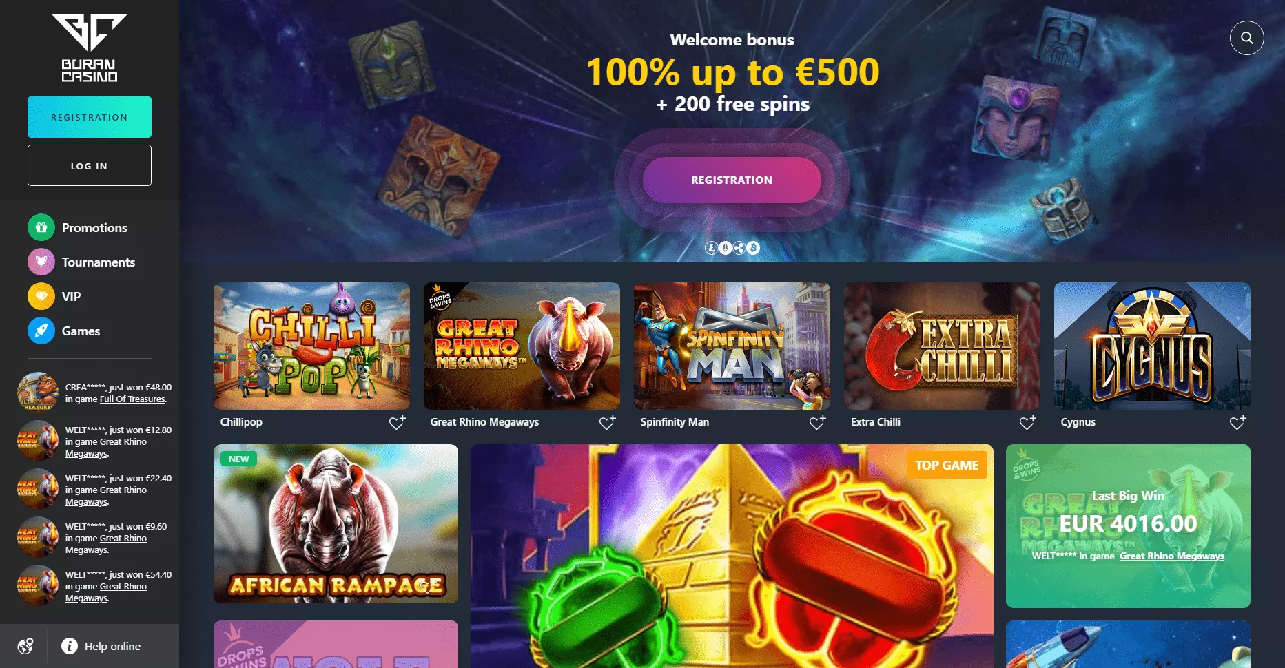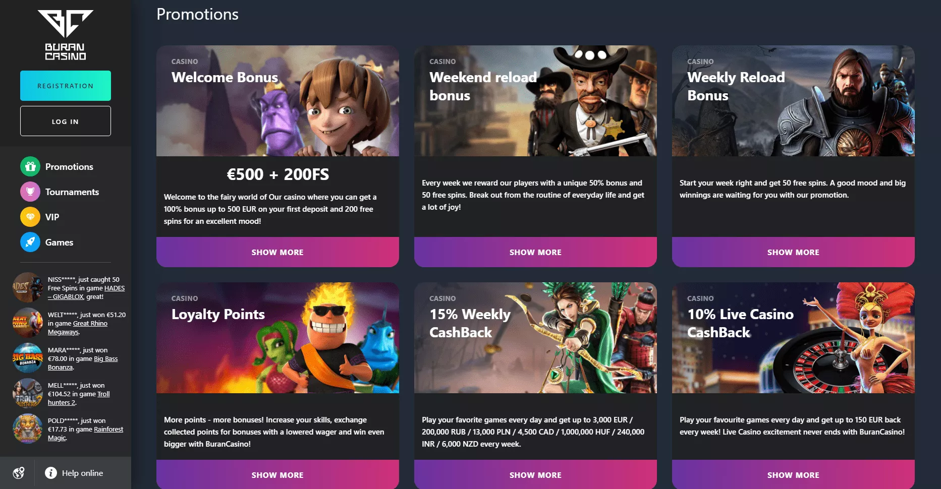 W Buran casino bonus powitalny to premia 100% do 2000 złotych oraz 200 darmowych spinów. Aby uzyskać premię, należy zarejestrować nowe konto (po raz pierwszy) i wpłacić depozyt. Nie jest wymagany żaden dodatkowy Buran casino bonus code.