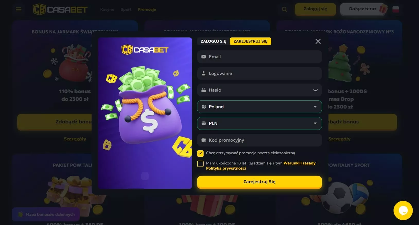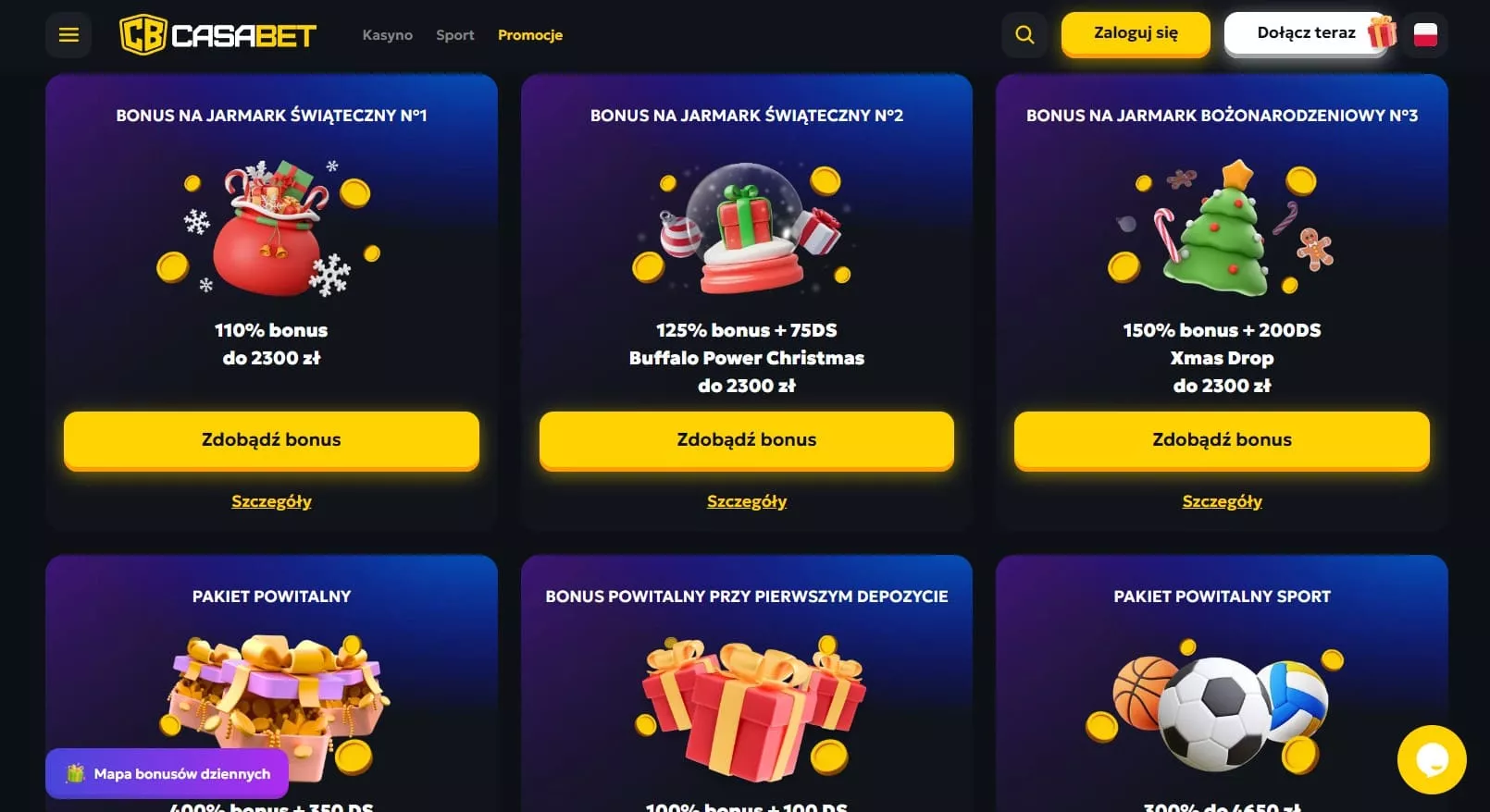 Nasi eksperci dokładnie przeanalizowali dostępne promocje w Casabet Casino, aby przedstawić najbardziej atrakcyjne oferty dla graczy z Polski. Kasyno udostępnia szeroką gamę bonusów zarówno dla fanów gier hazardowych, jak i zakładów sportowych. Obecnie dostępnych jest aż pięć głównych promocji na start: