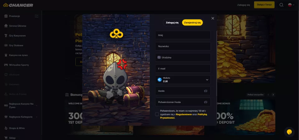 Utwórz nazwę użytkownika, podaj adres e-mail i wprowadź hasło. Wypełnij formularz rejestracyjny, podając imię, nazwisko, walutę, adres, numer telefonu. Zaakceptuj regulamin i potwierdź, że masz ukończone 18 lat. Jeśli posiadasz kod promocyjny dla Chancer-bet, aby aktywować dodatkowe nagrody po rejestracji.