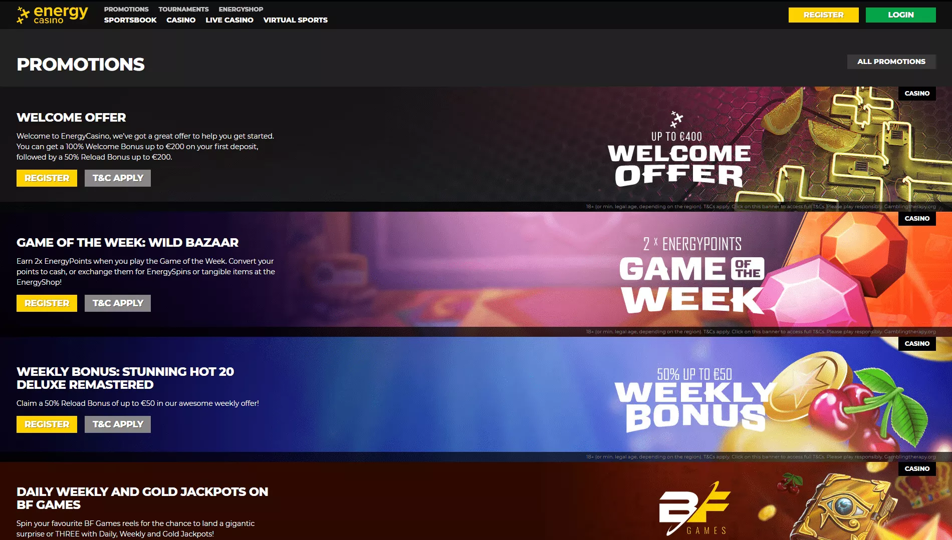 W tej części naszej recenzji przedstawiamy wybór najlepszych ofert oraz aktualne bonusy w kasynie Energy 2025, które są dostępne dla polskich graczy. Tutaj znajdziesz wszystkie informacje na temat wspomnianych bonusów, w części tekstowej na stronie.