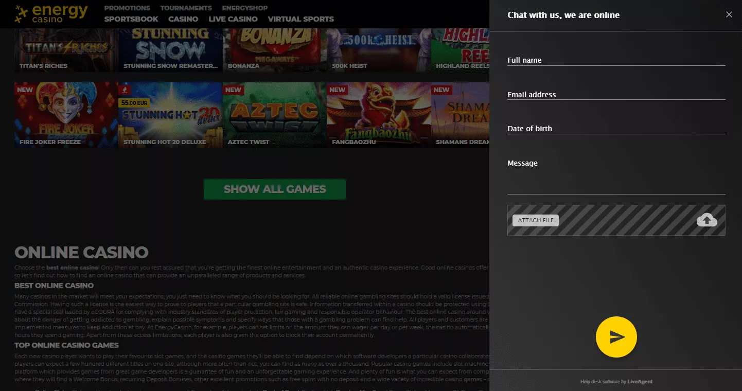 Energy casino czat online na żywo, który dostępny jest od poniedziałku do piątku w godzinach:. 09:00 – 00:00 (CEST), a weekendy w godzinach: 13:00 – 21:00 (CEST). Poza tymi godzinami następuje w Energy casino przerwa techniczna.