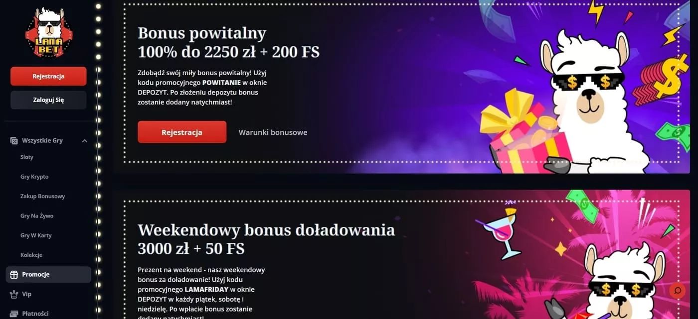 Bonus powitalny to zaledwie jeden z kilku dostępnych dla społeczności kasyna. W zakładce ofert zauważamy też inne nowe bonusy w kasynie Lamabet 2025: