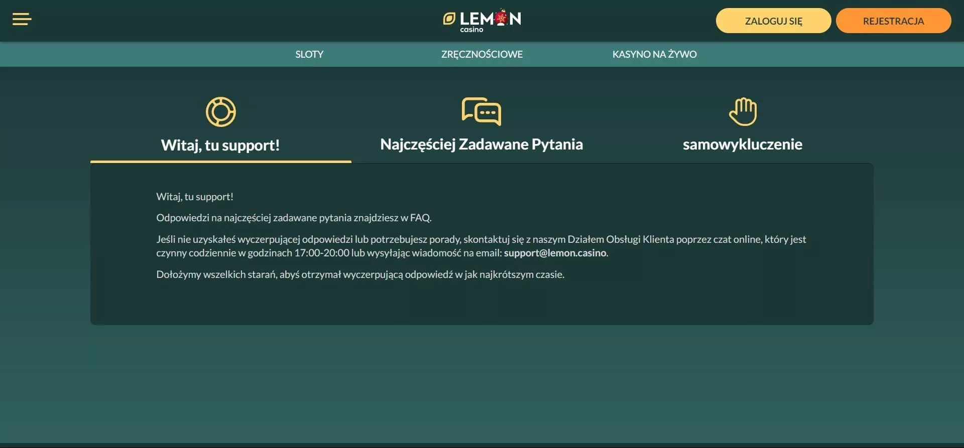 W ostatniej części testów sprawdziliśmy jakość kontaktu z działem obsługi klienta. Lemon Casino oferuje wsparcie poprzez czat na żywo oraz kontakt e-mailowy. Dział obsługi klienta działa codziennie w określonych godzinach oraz zapewnia odpowiedzi na większość pytań związanych z rejestracją, bonusami, weryfikacją konta i wypłacaniem pieniędzy.