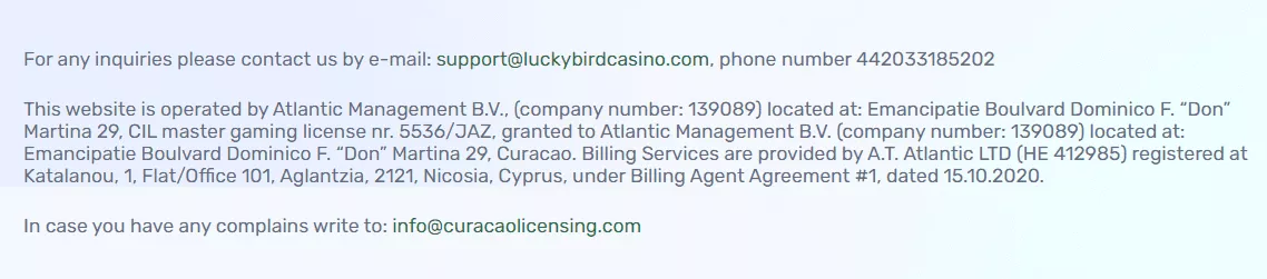 Kasyno online Lucky Bird jest zarządzane przez Atlantic Management B.V. i posiada licencję na świadczenie usług hazardowych, wydaną przez rząd Curacao. Strona internetowa Lucky Bird casino pl wyróżnia się certyfikatem SSL, gwarantującym bezpieczeństwo przesyłanych danych. Legalne Lucky Bird casino gwarantuje także uczciwe wyniki gier, bazujące na generatorze liczb losowych.