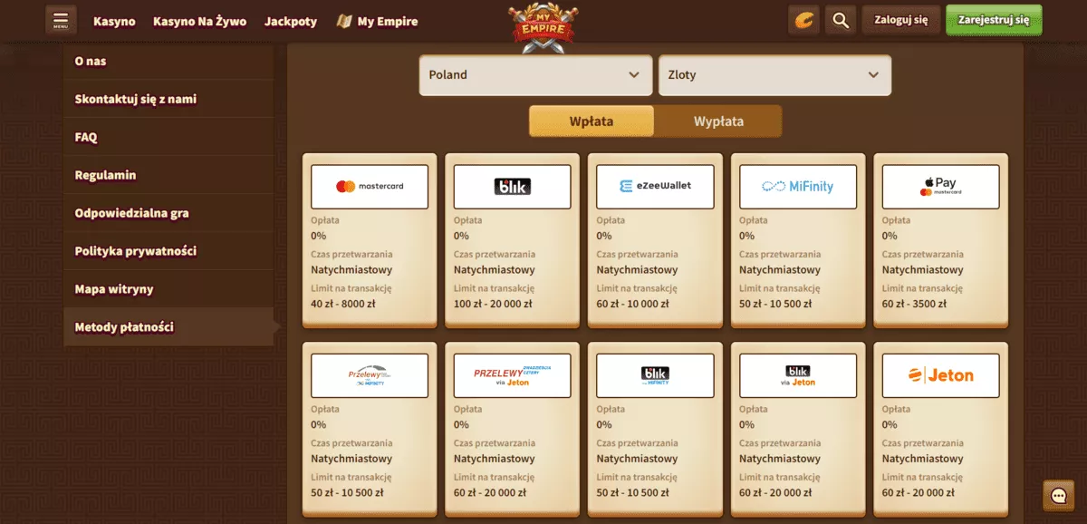 Metody depozytu i wypłaty w MyEmpire Casino mogą się różnić; niektóre opcje mogą być dostępne tylko dla jednego typu transakcji. Zazwyczaj jednak kasyno wymaga, by wypłata odbywała się tym samym kanałem, co wpłata.