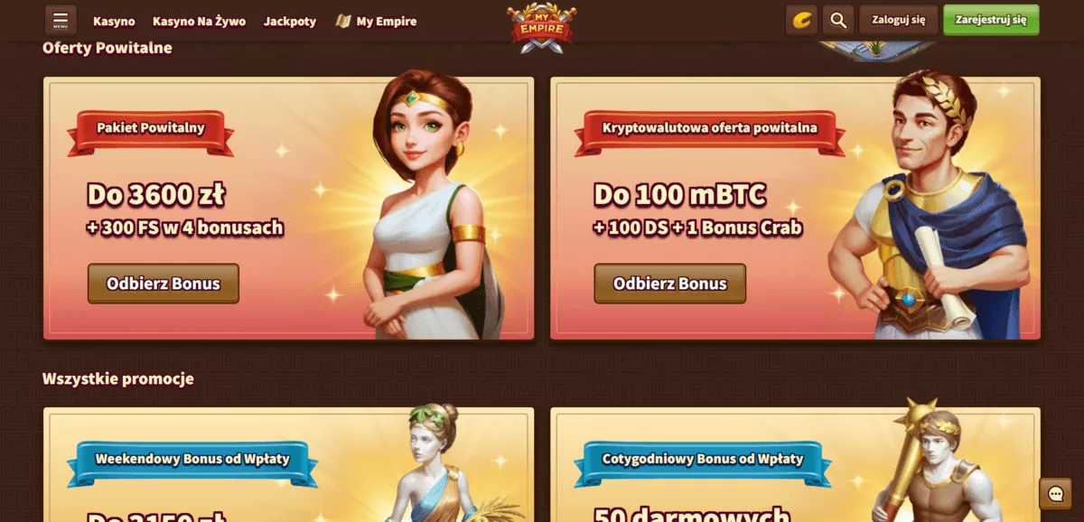 Aktualne bonusy w kasynie MyEmpire w 2025 obejmują pakiet powitalny dla nowych graczy z Polski, powitalny bonus na kryptowaluty, a także Program VIP i inne oferty dla stałych klientów. Każdą z tych promocji opiszemy w dalszej części recenzji.