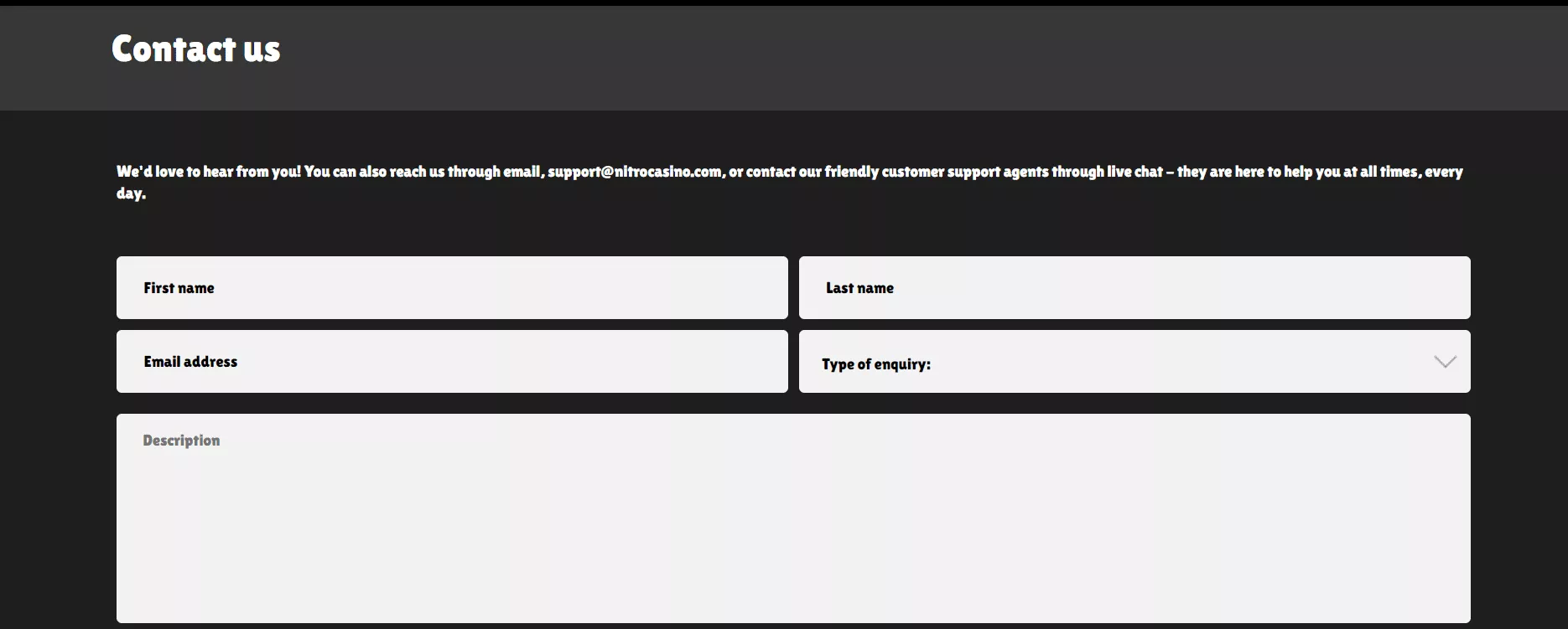 Nasza recenzja Nitro kasyno online dla polskich graczy 2025 nie może obejść się bez szczegółów na temat pracy obsługi klienta. Po zadaniu kilku pytań droga mailową oraz przez formularz na stronie dość szybko uzyskaliśmy odpowiedź na zadane pytania. Pracownik wyjaśnił nam zasadę przyznawania bonusu na start i kwestię obsługi jednej z metod płatności.