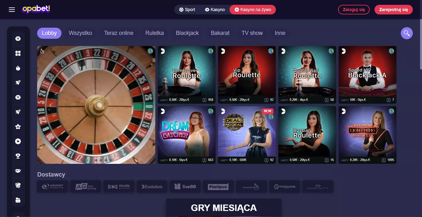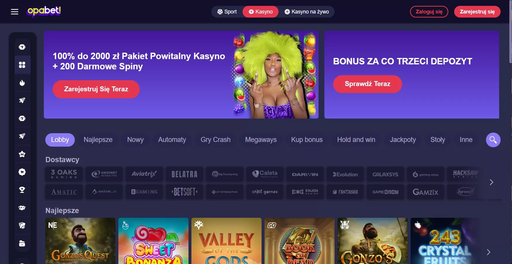 Kasyno OpaBet dla graczy z Polski posiada ponad 6000 gier od 50+ renomowanych deweloperów. Biblioteka obejmuje wiele kategorii: Najlepsze, Nowy, Automaty do gry, Gry Crash, Megaways, Kup bonus, Hold and Win, Jackpoty, Stoły, Inne i Ostatnio grane.