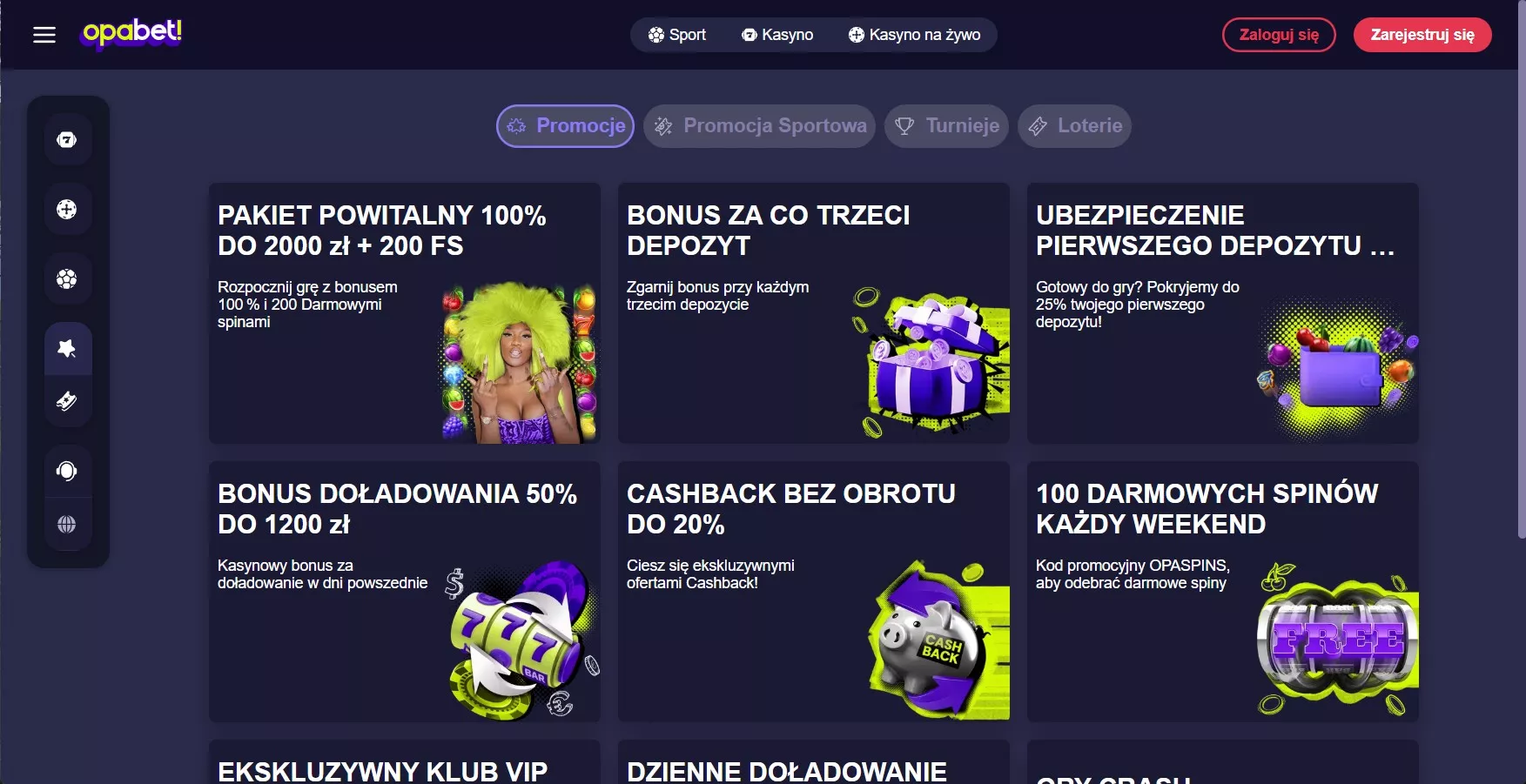 Operator posiada szeroki wybór promocji dla aktywnych graczy. Powitalne bonusy w kasynie OpaBet w 2025 roku, cashback i nagrody depozytowe umożliwiają regularne korzystanie z dodatkowych środków i darmowych spinów. Poniżej zestawienie najważniejszych ofert.