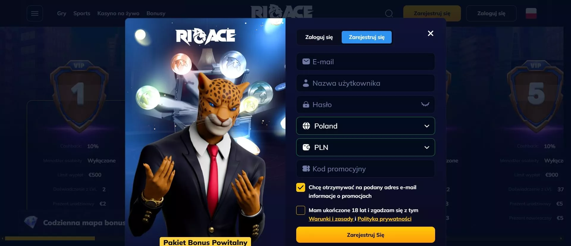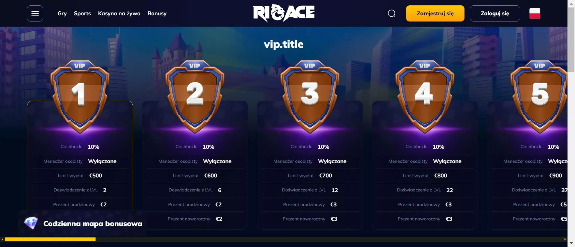 Oprócz tych ofert kasyno oferuje także turnieje, osiągnięcia, poziomy VIP i sklep z nagrodami. Odwiedź platformę Rioace za pośrednictwem linku Dobramine i odbierz bonus tuż po rejestracji konta.