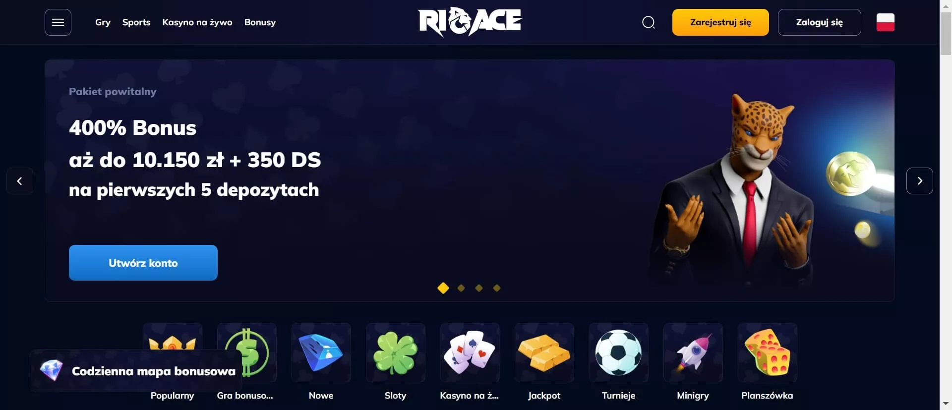 Rioace casino to popularna witryna hazardowa, która powstała w 2014 roku. Pakiet powitalny obejmuje nagrodę 400% do 10 150 PLN i 350 darmowych spinów. Kasyno dysponuje szeroką biblioteką gier, z ponad 9000 tytułami do wyboru. Bonusy i Promocje w Kasynie Rioace dla Polskich Graczy w 2025 Roku.