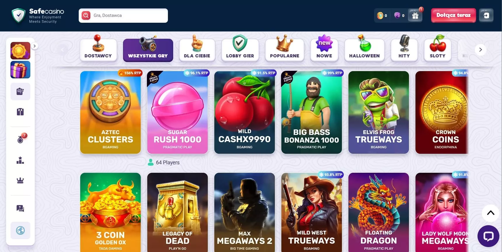 Na oficjalnej stronie znajduje się ponad 4000 gier od 110+ dostawców. Gry w Safe Casino obejmują tytuły na żywo, klasyczne gry stołowe, tytuły z funkcją „kup bonus” oraz gry natychmiastowe. Gracze mogą także wybierać spośród hitów sezonowych, takich jak tematyczne sloty Halloween czy najnowsze premiery tygodnia.