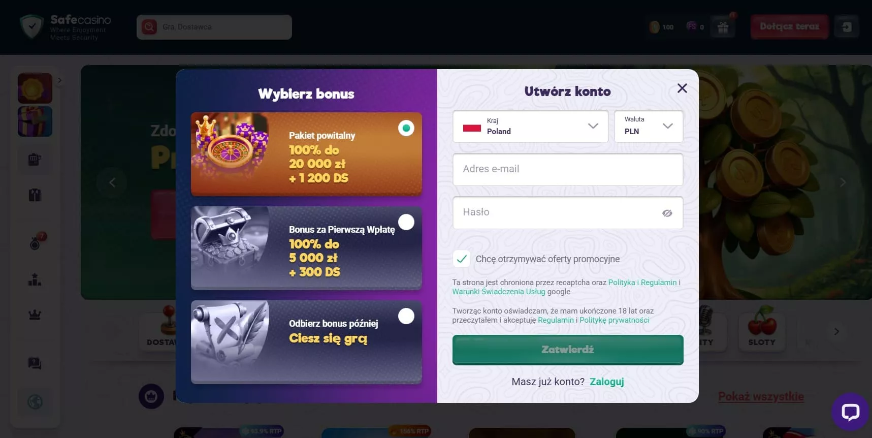 Wejście do panelu gracza odbywa się przez przycisk strzałki widoczny w prawym górnym rogu strony. Po wpisaniu adresu e-mail i hasła system automatycznie przekierowuje użytkownika do konta. Safe Casino stosuje zabezpieczenia SSL oraz weryfikację dwuetapową, co skutecznie chroni dostęp do profilu gracza.