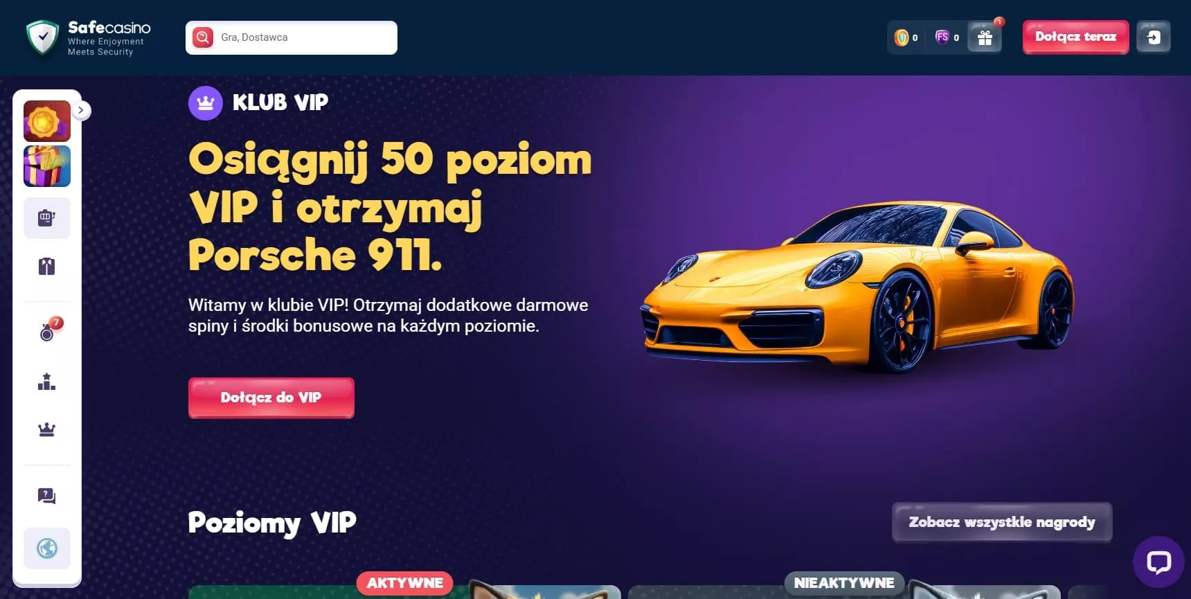 Oprócz tych ofert, aktywny program VIP w kasyno Safe przewiduje wyjątkową nagrodę — Porsche 911 na 50. poziomie. Gracze mogą też wykonywać Misje, które pozwalają zdobywać free spiny lub gotówkę. W Centrum Nagród można śledzić postęp obrotu i status aktywnych promocji. Lista najlepszych graczy prezentowana jest w Sali Sław.