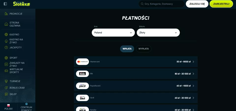 Slotexo udostępnia różnorodne opcje płatnicze, z których polscy gracze mogą skorzystać w swobodny sposób. Co więcej, Slotexo Casino umożliwia korzystanie ze złotówek.