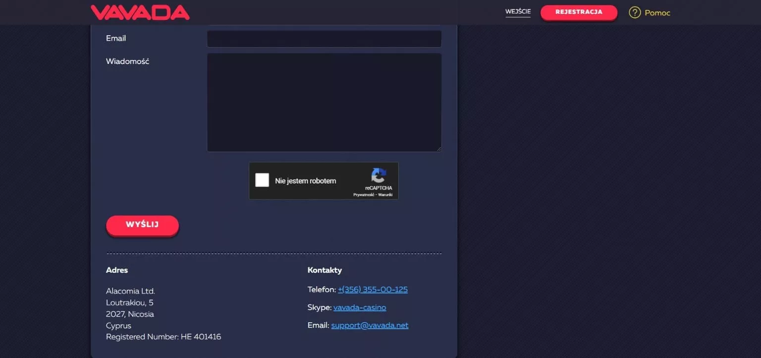 Dostępny jest także adres e-mail (support@vavada.net), pod który można wysłać swoje zapytanie, formularz kontaktowy, kontakt poprzez Skype, a nawet numer telefonu (+(356) 355-00-125). Wszystko po to, aby zapewnić wszystkim graczom wygodny dostęp do pomocy, kiedy tylko będzie to konieczne.