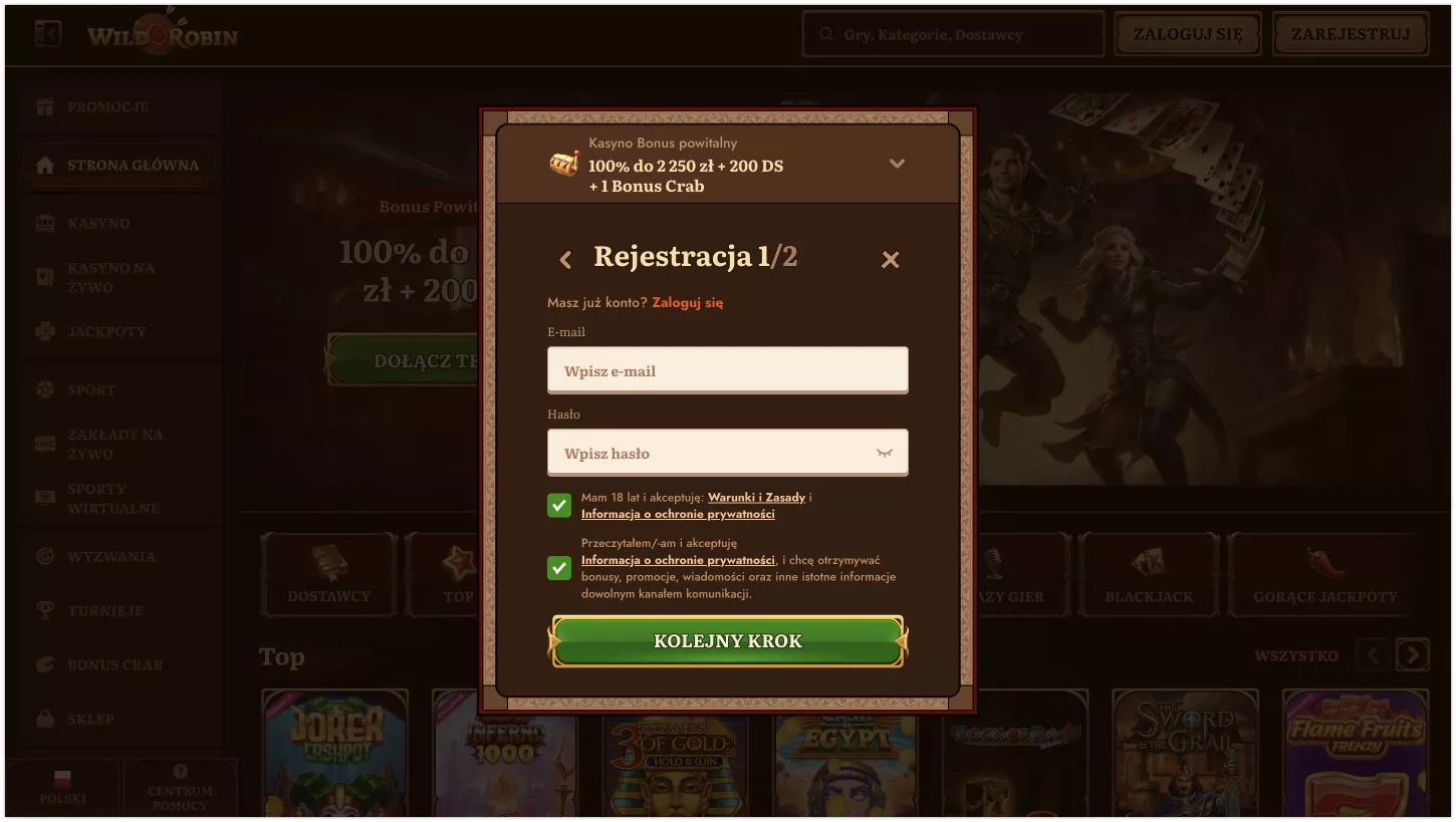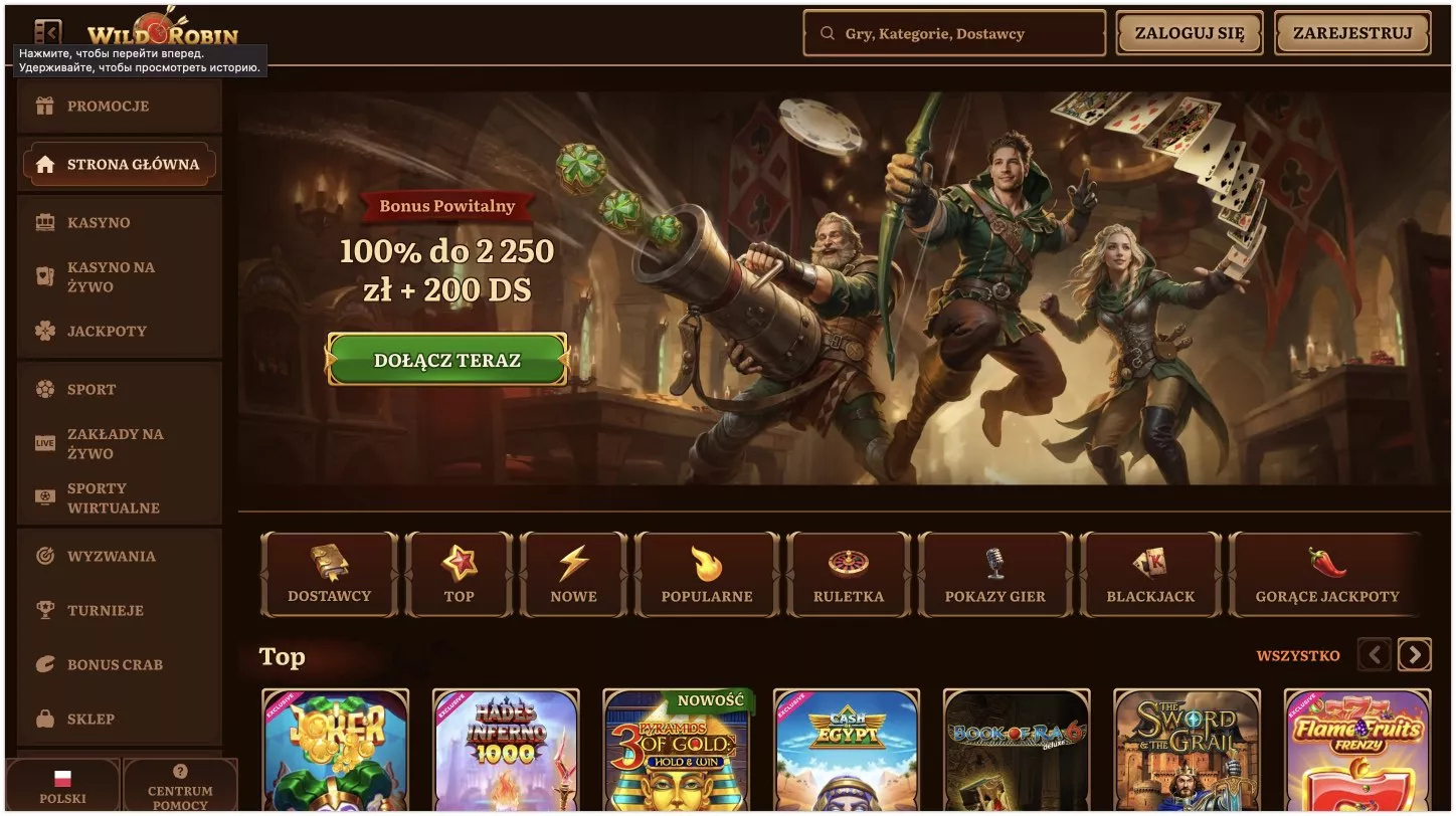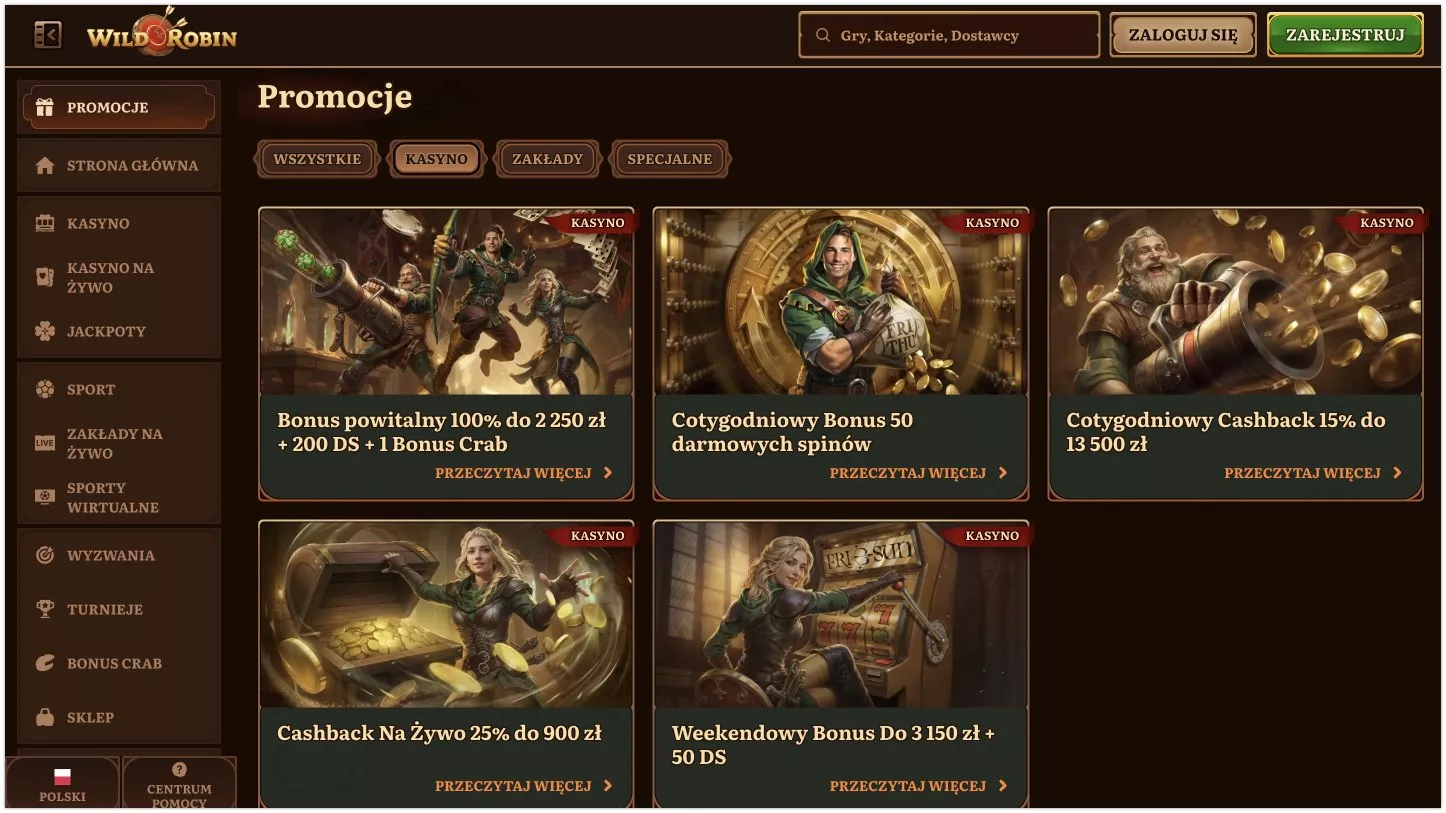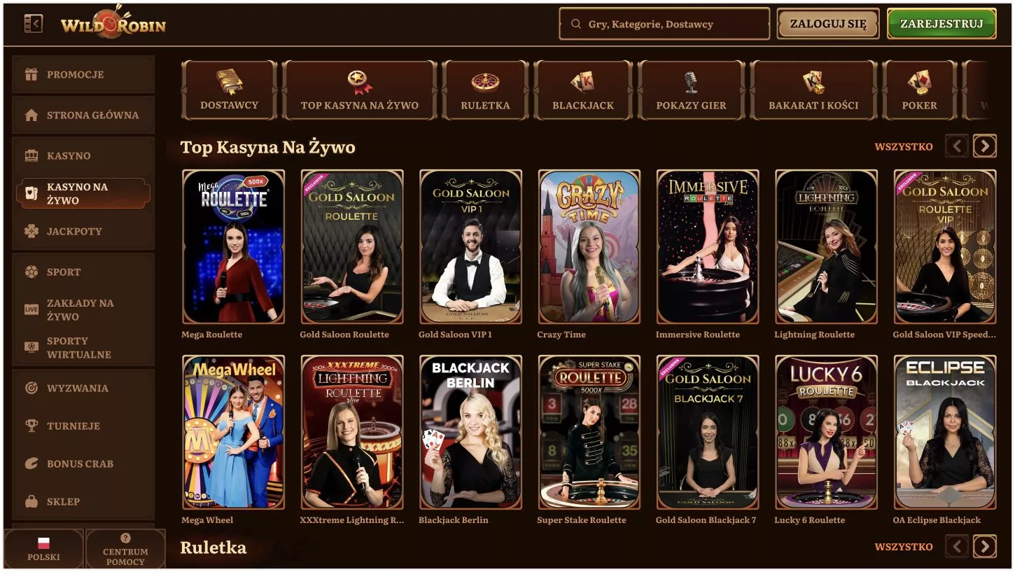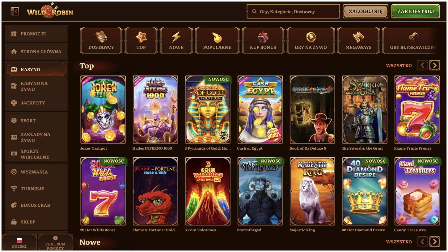 Kasyno wirtualne Wild Robin zadebiutowało na rynku w 2024 roku pod skrzydłami Luxinero Group. Gracze mogą wybierać spośród imponującej biblioteki ponad 17 000 gier, obejmującej sloty, gry stołowe i gry na żywo. Strona jest w pełni spolszczona, a program lojalnościowy oferuje 5 poziomów nagród dla lojalnych użytkowników. Wild Robin wyróżnia się atrakcyjną ofertą powitalną, która obejmuje 2250 PLN i 200 free spinów. Poniższa recenzja Wild Robin kasyno w Polsce szczegółowo omawia dostępne gry, promocje i funkcje kasyna.