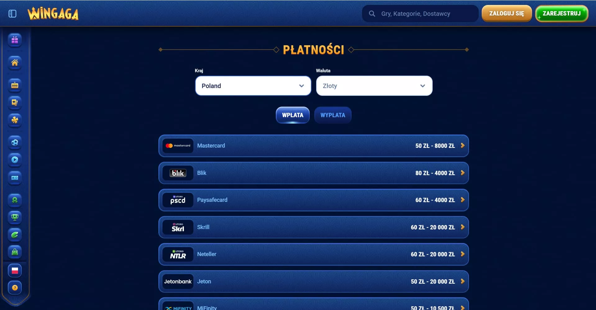 Kasyno internetowe oferuje szeroki wybór metod płatności, umożliwiających szybkie i bezpieczne wpłaty oraz wypłaty. Do dyspozycji graczy jest 16 opcji do wpłaty depozytu w WinGaga i 15 metod realizacji wypłat. Poniżej znajduje się tabela przedstawiająca dostępne opcje i limity płatności.