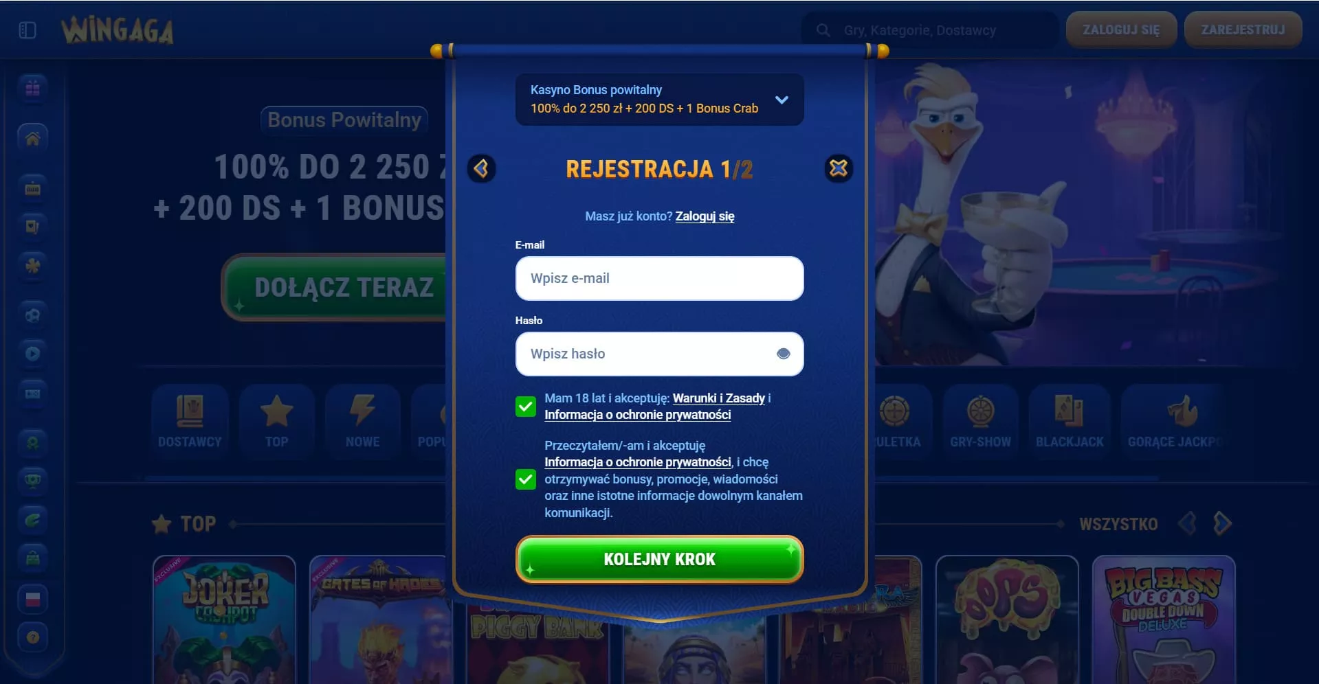 Logowanie do kasyna WinGaga odbywa się poprzez kliknięcie przycisku „Zaloguj się” w prawym górnym rogu strony. Następnie należy wpisać adres e-mail i hasło podane podczas rejestracji.