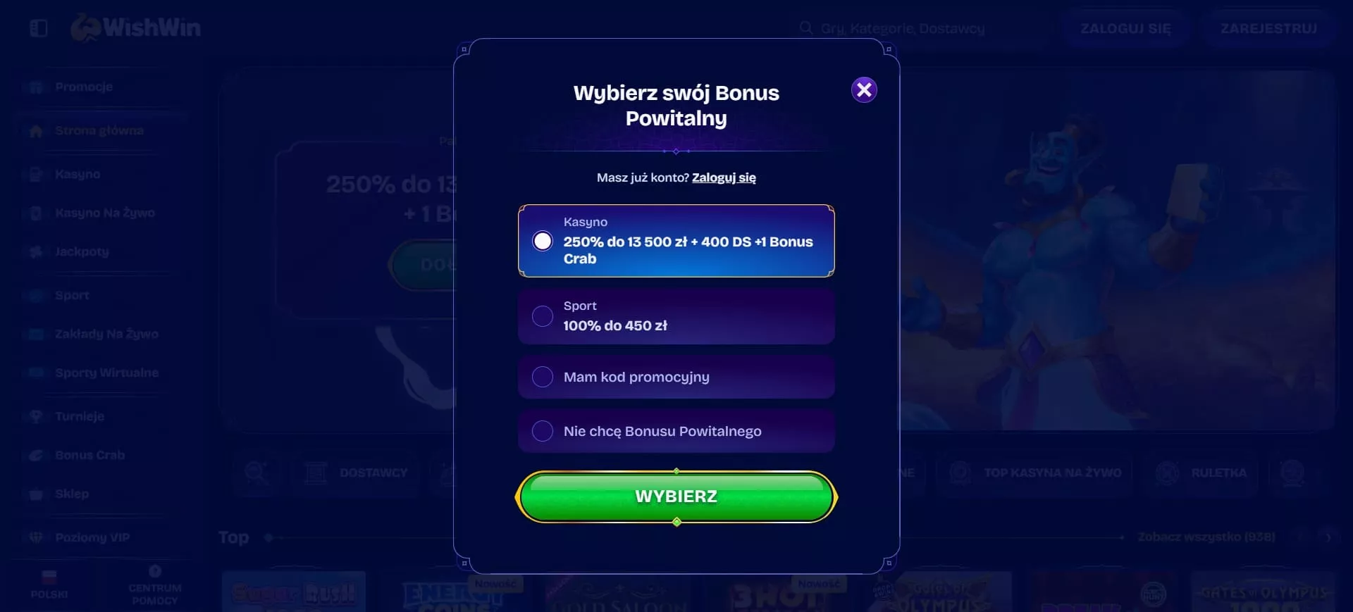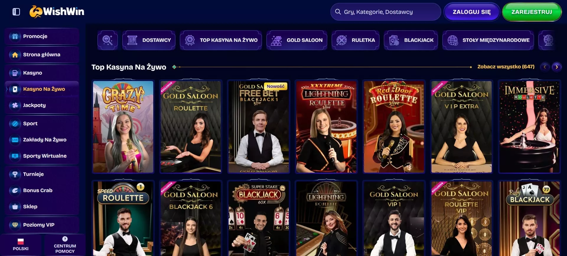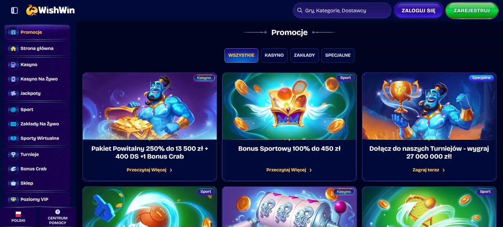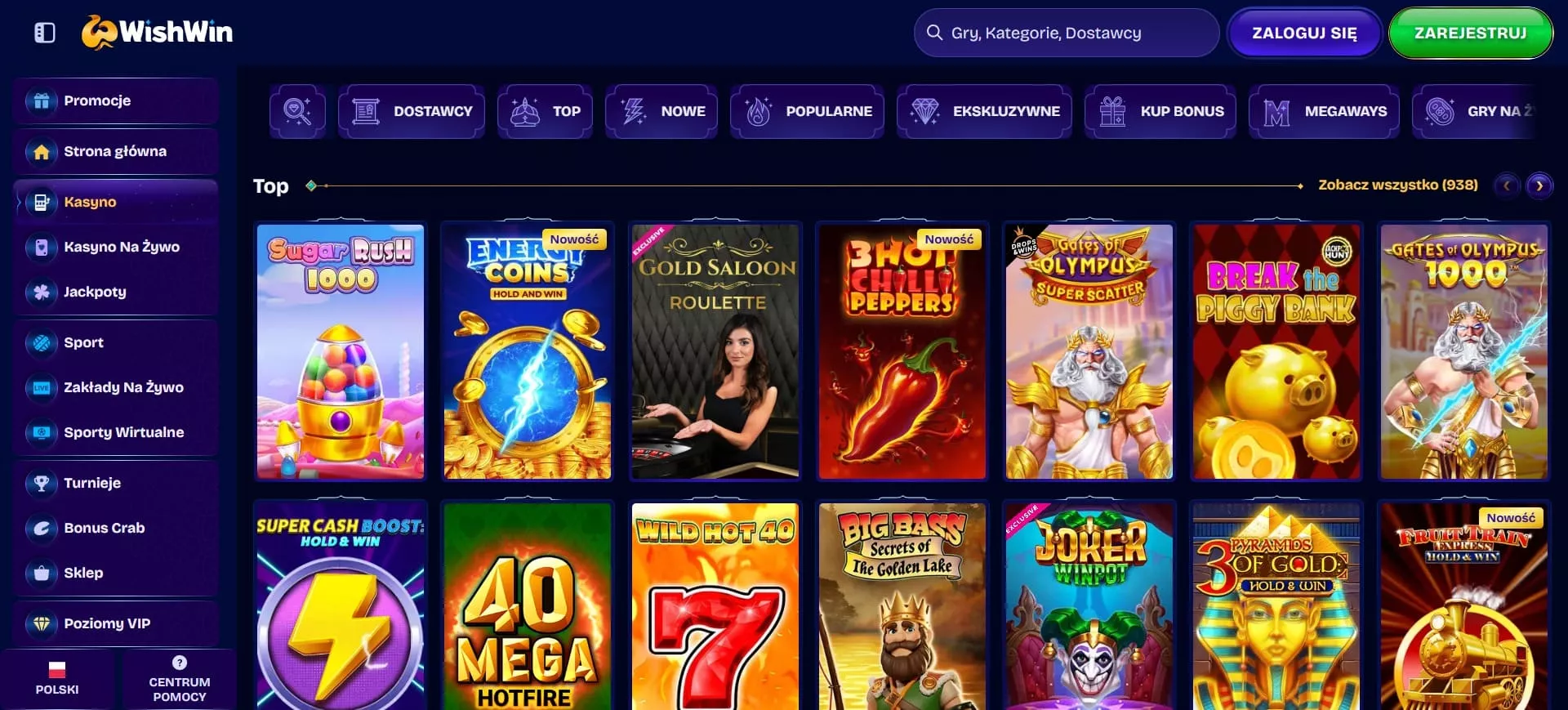 Gry kasynowe WishWin to ponad 5000 tytułów od 90 renomowanych dostawców. Platforma oferuje szeroką gamę kategorii: sloty, gry stołowe, kasyno na żywo, megaways, gry z funkcją zakupu bonusu oraz gry błyskawiczne. WishWin dla graczy z Polski zapewnia dostęp do lokalnych wersji gier i pełne wsparcie językowe.