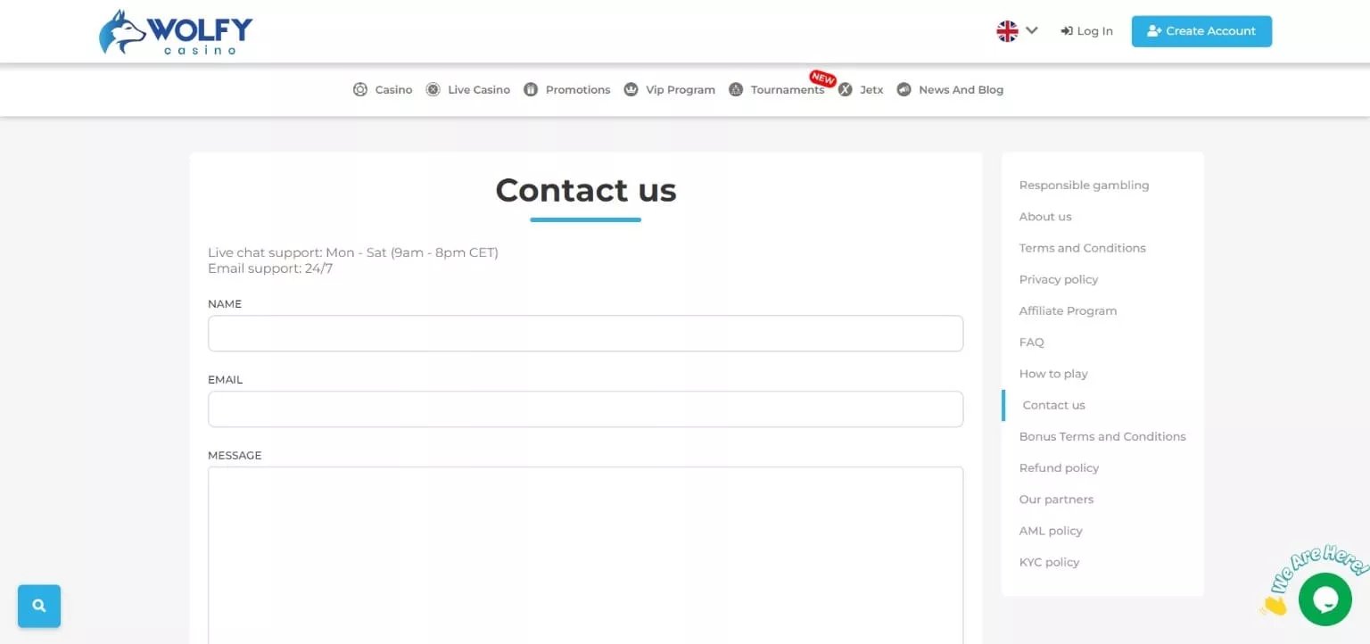 Wolfy kasyno online udostępnia swoim klientom kilka opcji kontaktu z obsługą, która została odpowiednio wyszkolona, aby szybko i w satysfakcjonujący sposób odpowiedzieć na wszystkie najbardziej palące pytania. Skontaktuj się z pracownikami kasyna za pomocą: