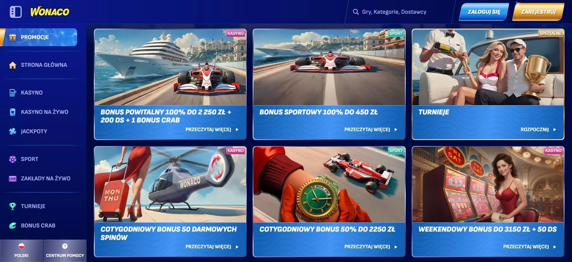 Wonaco posiada jasno wyodrębnione kategorie gier, w których możemy stawiać zakłady. W głównej sekcji znajdują się automaty wideo, zdrapki, bingo oraz gry typu crash – jest ich ponad 8 000. Odrębną zakładkę stanowi kasyno live. Operator w menu po lewej stronie umieścił również jackpoty. Nieco więcej kategorii jest w centralnym lobby.