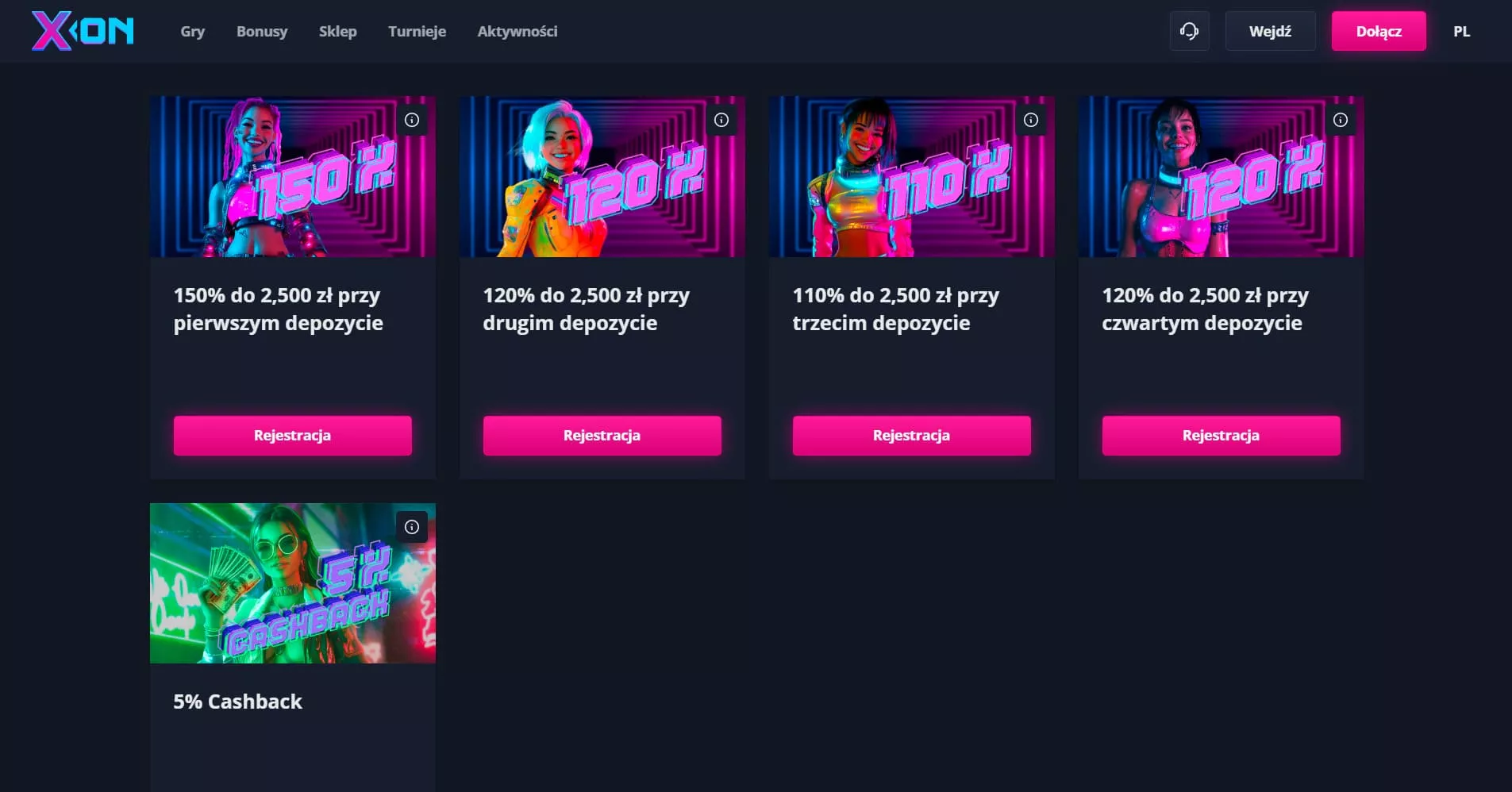 Operator oferuje szeroki wybór bonusów i promocji, które mogą zainteresować zarówno nowych, jak i stałych graczy. Główne promocje w kasynie Xon Bet obejmują pakiet powitalny, cotygodniowy cashback, a także dodatkowe korzyści dostępne w programie VIP oraz w sklepie lojalnościowym.